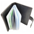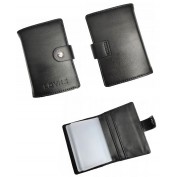 Etui jest zapinane na zatrzask i posiada 26 kieszeni na kartę oraz 4 dodatkowe kieszenie w oprawie na dokumenty.